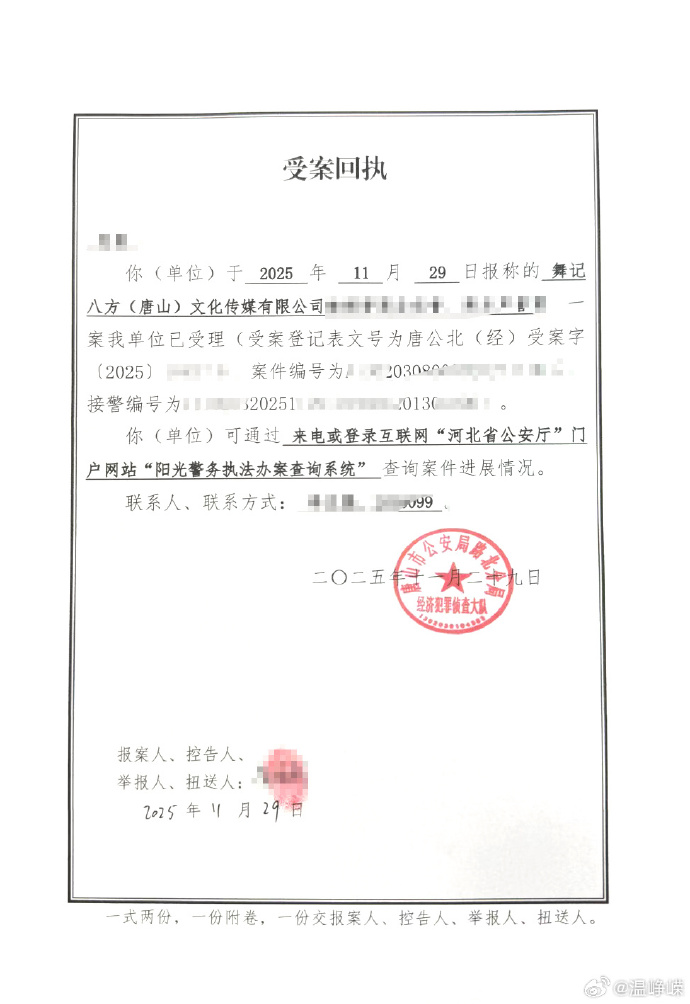 12月1日,演员温峥嵘在社交平台晒出唐山市公安局路北分局的受案回执,并配文字称“报警立案”,同时发出声明。